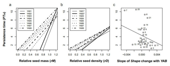 Across the species, predicted persistence was not related to M, V, D nor any of the three indexes for seed forms, using data for control seeds (results not shown). On the other hand, the PT50 was negatively related to the rM of buried seeds (Figure 5a). The relationship of the rM with PT50 for YAB 1 and YAB 2 cohorts was much steeper compared to the remaining YAB cohorts, suggesting that the seed species losing their mass in the first two years of burial survive in soil relatively shorter. The results were also similar for PT05, with the exception of the insignificant relationship with YAB 1 (not shown). The relative volume of neither cohort significantly explained the PT50 nor PT05 (not shown), and neither did the relative density of YAB 1 and YAB 2. In contrast, seed persistence was negatively affected by the decrease in relative density in cohorts of YAB 3–8 (Figure 5b), suggesting that seeds that lose relatively more mass than volume suffer from shorter lifespan in soil. Change in seed form indexes seemed to affect the predicted persistence (Figure 5c), but the effect was due to the outlying G. urbanum seed, which greatly changed its shape as a result losing seed coat and its appendages, so the trends were no longer significant when this species was removed from the analyses.