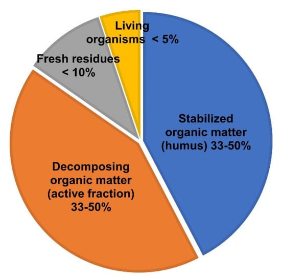Organic matter is the center of nearly all life activities in the soil including that of the microflora, the fauna, and the root systems of higher plants. Soil organic matter (SOM), especially its stabilized fraction (humus) (Figure 1), plays a crucial role in soil physical, chemical and biological fertility [16]. The amount and types of SOM are principally determined by the continuous physical and chemical action of soil organisms. Soil fauna and microbes are crucial for shredding, transformation and decomposition of SOM [1,2]. For this reason, studies focused on the understanding of soil microorganisms–SOM and macrofauna–SOM interactions are particularly relevant.