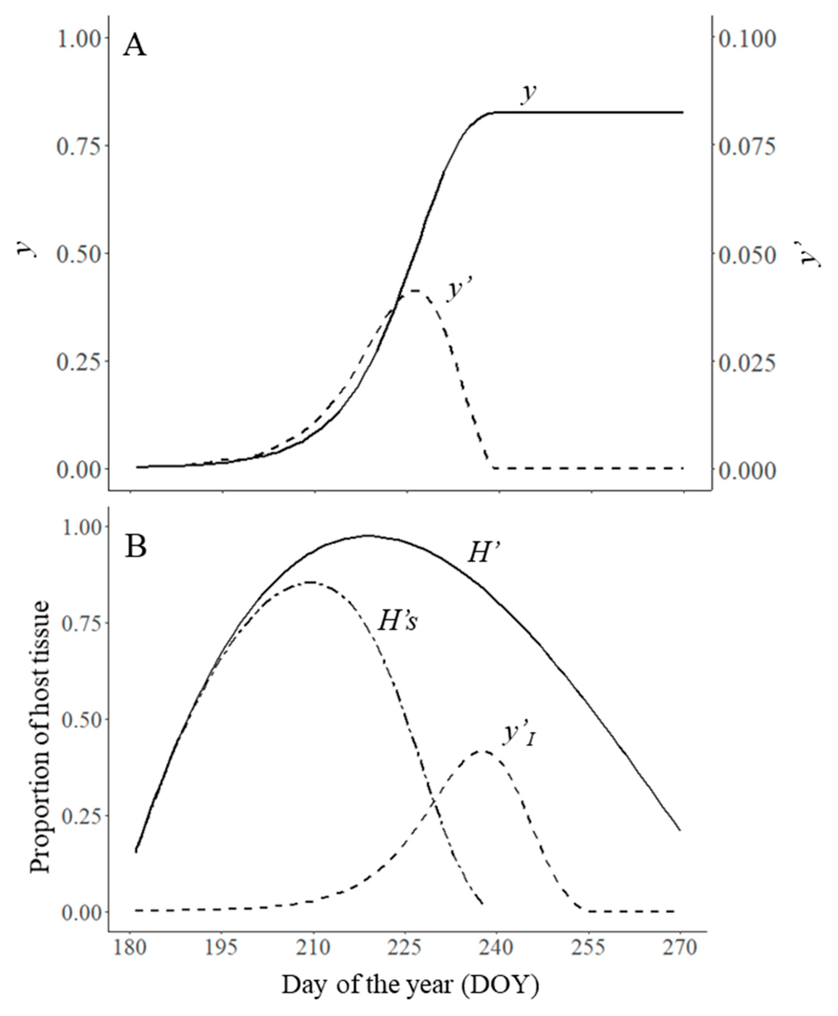 | yt – I − p | Diseased tissue that had passed through the latent and infectious period by time t (removed or post-infectious diseased tissue) (yR) (P) |
