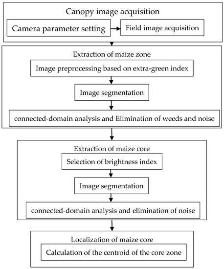 By comparing the accuracy rates and segmentation times of six common algorithms(i.e., (i) the continuous max-flow algorithm, (ii) minimum cross entropy, (iii) ISODATA, (iv) Otsu, (v) k-means, and (vi) fuzzy thresholding segmentation) [25,26,27,28,29,30,31], we select the three with the best segmentation results (i.e., minimum cross entropy, ISODATA, and the Otsu algorithm) and use them to recognize the positions of maize cores based on four core brightness indexes (i.e., gray, Y, vHSV, and extra-green) [21,33,34,35] (12 combined strategies in total). After experimental validation with many field images, the core localization effects of 12 combined strategies are compared. We find that the minimum cross entropy method based on gray is best at extracting maize cores, which can deliver real-time and accurate fertilization in the field. The minimum cross entropy method [26] solves the problem of selecting threshold values in image segmentation, through the minimum cross entropy between the image and other zones. Figure 2 shows a flowchart of the algorithm for the real-time recognition of maize cores at the seedling stage.