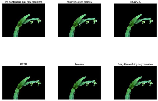 According to Figure 7, the extraction effects of the six segmentation methods in maize images with fewer weeds on a sunny day are better. Compared with the other methods, the continuous max-flow algorithm shows a higher accuracy rate. In particular, the effect of a sample with more weeds on a cloudy day is better. However, the six methods were also assessed based on the segmentation time, in which three applicable segmentation methods will be selected after comprehensive consideration.
