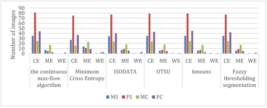 After obtaining the image processing results for the extracted maize zone, the results were classified and analyzed using Excel. We divided the segmented images of the maize zone into four processing results, namely, (a) the maize zone is extracted correctly; (b) the background with part of the weeds is also extracted when the maize zone is extracted; (c) the soil background is also extracted when the maize zone is extracted; and (d) incorrect extraction, i.e., the maize zone is not extracted or is extracted incompletely. Such statistical and classification results are useful to strictly distinguish the image segmentation results and to avoid the influence of subjective factors. To adhere to the requirements of the subsequent analysis, we labeled (a) as “correct extractions“ (CE); integrated (b) and (c) and labeled them as “multiple extractions“ (ME); and labeled (d) as “wrong extractions“ (WE). Figure 7 shows the statistical results of the six segmentation methods (i.e., (i) the continuous max-flow algorithm, (ii) minimum cross entropy, (iii) ISODATA, (iv) Otsu, (v) k-means, and (vi) fuzzy thresholding segmentation). The x-coordinate indicates the three processing results for the six segmentation methods, while the y-coordinate indicates the amount of each processing result. Different colors represent different sample classes, i.e., image samples collected under different illumination and weed conditions.
