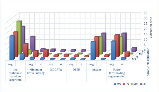 Figure 8 shows the average time (avg) and standard deviation (σ) for extracting images of the four classes of samples with the six segmentation methods. According to Figure 8, because of their shorter segmentation times and smaller standard deviations, minimum cross entropy, ISODATA, and Otsu run stably, and faster. Then combined with the statistical results for the accuracy rate as shown in Figure 7, we selected these three segmentation methods for core recognition and localization, i.e., minimum cross entropy, ISODATA, and Otsu.