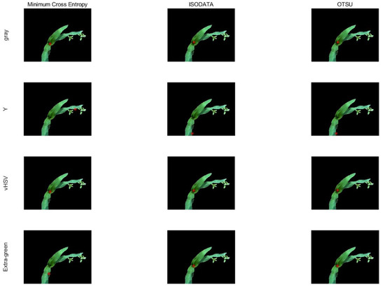 Based on the difference in brightness between the maize core and the other parts of the plant, we selected three segmentation methods (i.e., minimum cross entropy, ISODATA, and Otsu) and four brightness indexes (i.e., gray, Y, vHSV, and extra-green) for core recognition. The effects of 12 combination strategies were compared (from three segmentation methods and four brightness indexes); see Figure 9 for the effects.