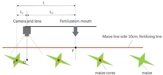 When collecting data, the camera is vertically installed at the front of the fertilizer with the lens directed downward. Therefore, in the projection direction of the fertilizing line, the spatial orientation distance L depends on the relative distance L1, which between the core P and the central field of view point O of the camera, and the relative distance L2 from the point O of the camera to the fertilization mouth F, see Figure 12. Due to the fixed installation angle and height and the other camera parameters, L2 is a measurable value. The distance L1 can be calculated using a camera calibration method based on a single-plane checkerboard [37]. The error due to vibration can be decreased and compensated for, by installing a shock attenuation device and an angle stabilometer as required.