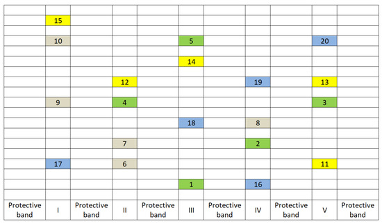 Diagram of the experimental plots’ placement in the field (plots 1–5 control-without weeding, plots 6–10-band spraying, plots 11–15-conventional spraying, plots 16–20-manual weeding. The transverse distance between plots was a minimum of 1.5 m (field patch width). The longitudinal distance within the band (field patch) was a minimum of 10 m. The protective band was 1.5 m (field patch width).