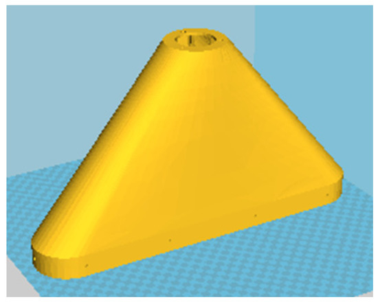 For band spraying, a prototype machine was used, which was built specially for the purpose of the study (the solution is subject to a patent application). The assumption was to apply the spray liquid to the largest area of the field possible, without contact with the crop. As a base for the construction of the machine, a conventional field-mounted sprayer was used with full equipment except for the spray boom. It was placed on a specially designed frame. Each of the spraying sections were placed on a parallelogram construction with a support wheel, enabling ground copying. The essence of this solution was the possibility to apply herbicides to the inter-row surface of the field with full reduction of the contact with the cultivated plant. The spray heads were covered with individually designed herbicide shields (shields were made in 3D printing technology). The shield is presented in Figure 3.