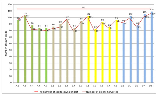 The chart below (Figure 7) shows the average number of onion plants in the seedling phase on the date of 11 May 2016 and the total number of harvested onions for each plot on 2 September 2016 in relation to the average number of seedlings at the level of 113 pieces.