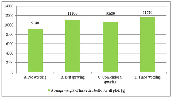 The weeding methods showed significant differences taking into account the weight of onions in the productive yield (Figure 13). The lowest average yield was obtained on the plots without weeding. On plots weeded with the band spraying method, there was the highest probability of obtaining a weight of 11,050 g, whereas in the case of the conventional spraying method, there was the probability of obtaining a weight of 10,500 g. The highest dominant occurred in the group of manually weeded plots and it amounted to 11,500 g. The highest productive yield among the individual plots was obtained from the B group plot and it was 13,290 g.