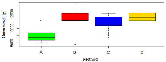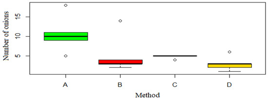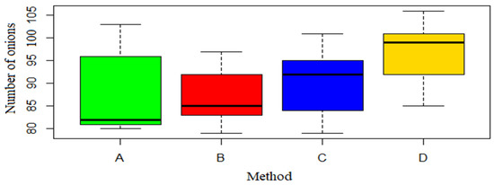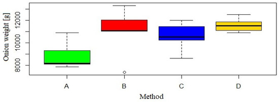 In terms of the number of harvested onions, the cultivation method without weeding was significantly statistically different from the manual weeding (Figure 10). The dominant value for group A was 20 pieces lower than in group D. The analysis showed no significant differences in the number of onions for the B and C methods.