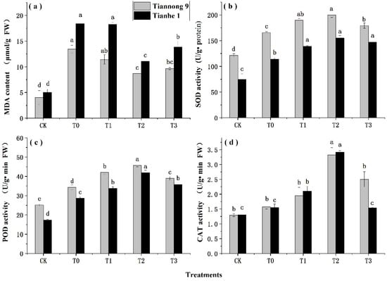 The effects of different concentrations of BL on the MDA content in maize seedlings under chilling stress are shown in Figure 2a. The MDA content of the two maize varieties was significantly higher than that of the CK under chilling stress. After treatment with T0–T3, the MDA content of seedlings decreased first and then increased with increasing BL concentration, and the MDA content reached the minimum level during the T2 treatment. The MDA content of Tiannong 9 and Tianhe 1 treated by T0 was increased by 234.04% and 267.07% compared with that of the CK treatment, respectively, and the increase range was Tianhe 1 > Tiannong 9. The MDA content of Tiannong 9 and Tianhe 1 decreased by 35.31% and 40.01%, respectively, following T2 compared with T0. The activities of SOD, POD and CAT in the two maize varieties were significantly higher than those of the CK under chilling stress (Figure 2b–d). After treatment with T0–T3, the activities of SOD, POD and CAT in maize seedlings significantly increased. With the increase in BL concentration, the antioxidant enzyme activity of seedlings was opposite the MDA content, and maximum antioxidant enzyme activities were realized with T2. The activities of SOD, POD and CAT of Tiannong 9 and Tianhe 1 treated by T0 were increased by 36.42%, 35.97%, 22.09% and 52.39%, 64.58%, and 19.23%, compared with those of the CK treatment, respectively. The increase range was Tianhe 1 > Tiannong 9. The SOD, POD and CAT activities of Tiannong 9 and Tianhe 1 were increased by 20.68%, 33.47%, 110.58% and 35.99%, 46.28%, 120.43%, respectively, with T2 compared with T0. The results showed that spraying BL could significantly alleviate the increase in the MDA content and increase the activities of SOD, POD and CAT in maize seedlings under chilling stress, and T2 treatment had the best mitigating effects on cold damage in maize seedlings. There were significant differences among the different varieties. The decrease in MDA contents and increase in the three antioxidant enzyme activities after BL spray treatment of maize seedlings at low temperature were as follows: Tianhe 1 > Tiannong 9.