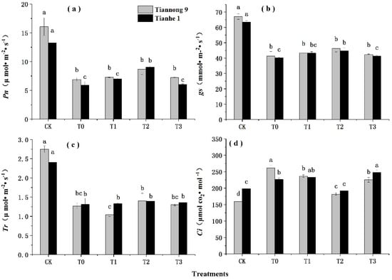 The Pn, gs and Tr (Figure 3a–c) of the two maize varieties were significantly lower under chilling stress than those of the normal temperature treatment, and the Ci (Figure 3d) was higher under chilling stress than under the normal temperature treatment. After treatment with T1, T2 and T3, the Pn, gs and Tr of maize seedlings under chilling stress significantly increased, and the Ci decreased. With the increase in BL concentration in T0–T3, the Pn, gs and Tr of the two varieties showed a trend of increasing and then decreasing, and the three indicators of the T2 treatment reached the maximum values. Under T2 treatment, the Pn of Tiannong 9 and Tianhe 1 increased by 25.43% and 52.75%, the gs increased by 11.86% and 11.26%, and the Tr increased by 10.78% and 5.93%, respectively, compared to those of T0. The change in Ci was the opposite. With the increase in BL concentration in T0–T3, the Ci of the two varieties decreased first and then increased, and the Ci value of T2 was lowest, but still higher than that of CK. The Ci of Tiannong 9 and Tianhe 1 decreased by 30.52% and 15.23%, respectively, compared with T0 during T2 treatment; the range in the variation of photosynthesis-related indicators was Pn > Ci > gs > Tr, and the difference among different varieties was significant. The decrease in Pn and the increase in Ci both showed the trend Tianhe 1 > Tiannong 9, and the trend for the gs and Tr was the opposite.