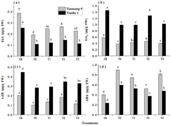 The IAA content of Tiannong 9 and Tianhe 1 decreased differently under T2 and T0. The IAA content of the two varieties increased by 19.08% and 14.47% under T2 and CK, respectively, compared with the T0 and CK treatments. The same trend was also seen in the GA3 and t-ZR content changes, which increased by 13.53% and 20.61%, respectively. The t-ZR content increased by 41.14% and 14.26%, respectively. ABA also plays an important role in the abiotic stress response. The ABA content of Tiannong 9 and Tianhe 1 decreased by 41.80% and 58.96% under T2, respectively, compared with T0. The ABA content of the two varieties were 92.94% and 93.26% lower under T2 and CK than under T0 and CK, respectively.