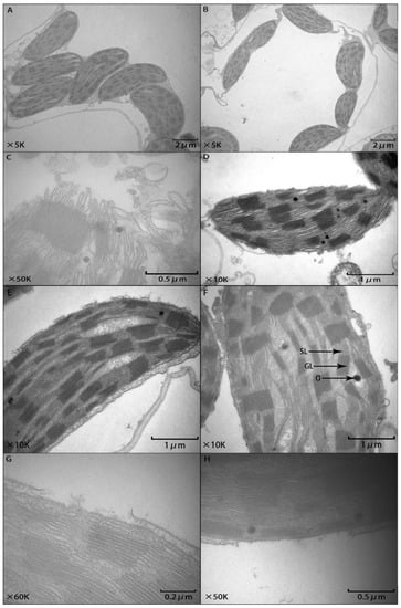 Effects of different concentrations of BL on chloroplast ultrastructures of maize seedlings under chilling stress. (A,B): CK; (C,D): Chilling stress T0 treatment; (E,F): Chilling stress T2 treatment; (G,H): A partial magnification of the chloroplast under T2 treatment; GL: Grana lamellae; SL: Stroma lamella; O: Osmiophilic granule.