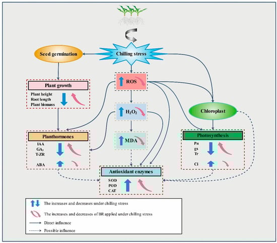 In conclusion, chilling stress significantly inhibited the germination and seedling growth of different maize varieties. Spraying BL at low temperature could alleviate the damage to maize under chilling stress. Different concentrations of BL had significant effects on the germination rate, agronomic traits, photosynthetic system, antioxidant system and endogenous hormone levels in maize, and the alleviation of chilling effects in maize seedlings was best with BL application at 0.1 mg/L. Most notably, under chilling stress, the germination rate and biomass of maize increased significantly. The SOD activity, POD activity, Pn, gs and ABA content of seedlings increased markedly, and the contents of MDA, Ci and IAA decreased significantly (Figure 6). These data show that the application of BL can alleviate the damage caused by chilling stress to varying degrees. The focus of this paper is mainly on the effects of exogenous BL on the cold resistance of maize under chilling stress. Whether the signal transduction of BL under abiotic stress is linked to its role in plant immunity and whether the application of exogenous BL will regulate the expression of cold resistance genes will be further explored in future studies.