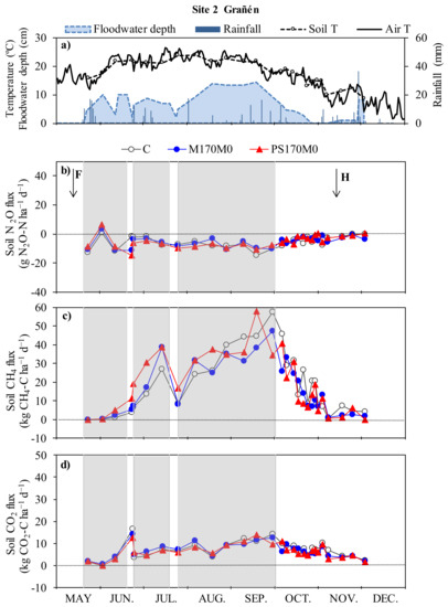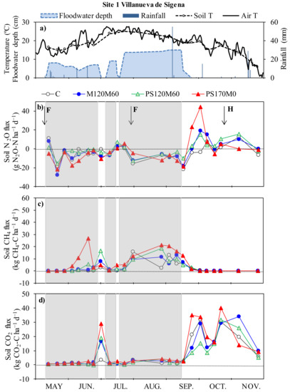 Site 1 (Villanueva de Sigena) year 2013. (a) Soil and air temperature, rainfall, and floodwater depth during the studied period; and (b) N2O, (c) CH4, and (d) CO2 emissions as affected by the fertilization treatment. Vertical arrows indicate the dates of fertilization applications (F) and harvest (H). The grey shaded areas represent the periods in which the water inflow to the field was open. Note that once water was stopped, the field remained flooded for several days.