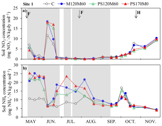 At site 1, soil ammonium concentration (0–0.1 m) ranged between 4.1 and 25.4 kg NH4+-N kg dry soil−1 (Figure 4b). Soil ammonium concentration was high in the first sampling dates in treatments with N application (M120M60, PS120M60, and PS170M0), then decreased in early June 2013 (Figure 4b) at the same time that nitrate concentration increased (Figure 4a) and after that, increased again at the same time that nitrate decreased. From July 2013 until the plot was drained, ammonium concentration decreased gradually. Once the field was drained, a slight increase was observed, but again NH4 lowered (Figure 4b), matching with an increase in nitrate concentration (Figure 4a).
