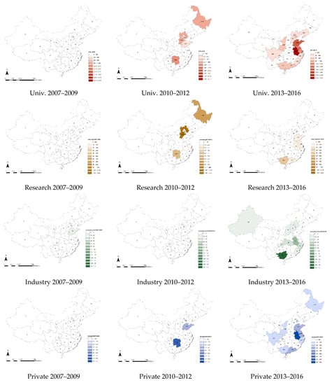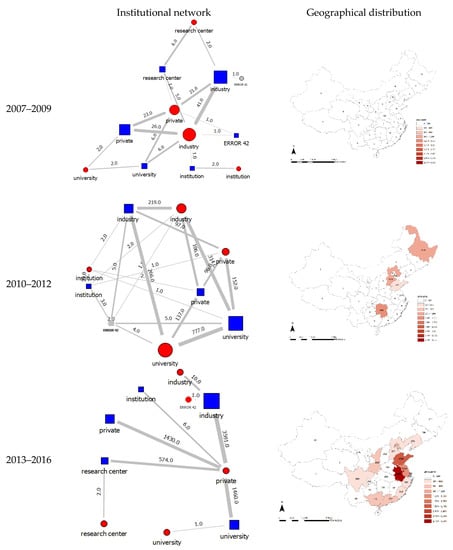 First, the local expansion of networks is notable in the process of knowledge creation of private businesses in such areas as Anhui (1682), Shandong (981), Jiangsu (886), and Guangxi (516). It can be seen that the private businesses that are relatively isolated from the network undertake technological innovations by continuously networking with knowledge providers (universities and research institutes). Second, regional networks appeared in small numbers in 2007–2009, and regional knowledge creation processes have been increasing over time. In the late 2000s, knowledge creation occurred in the Hebei–Hebei region and then moved to the Hunan–Hunan (2010–2012) and Anhui–Anhui regions (2013–2016). In Anhui, the number of patents of private businesses has increased rapidly in recent years (2013–2016). As shown in Table 2 1083 (2013–2016) knowledge creation networks were formed in Anhui in the same period, whereas 203 knowledge creation networks were formed in Guangxi and Anhui. In the case of Anhui, which has many private company knowledge networks, most of the networks are formed in the same area, which suggests that Anhui should strengthen external networks to prevent isolation from regional networks.