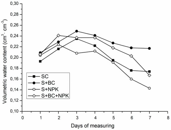 To determine impact of biochar addition on water content, during the experiment, the humidity of mixtures was measured daily for a period of 7 days with ProCheckGeomor Sensor (Geomor-Technik, Szczecin, Poland). Measurements were carried out in situ on substrates in pots with vegetation at the 8th week of experiment. Before humidity measurements, pots were adjusted with distilled water to the same content of water (0.26 of Volumetric Water Content, VWC). Measurements started from the next day; initially, 100 mL of water was added to each pot to keep 70% of the water-holding capacity. Soil water content corresponding to 100% field capacity was determined by weighing soil-filled pots after full watering. The weight corresponding to 70% field capacity was calculated, and the pots were watered to reach 70% field capacity (100 mL of water per pot per day). The quantity of 100 mL was estimated based on previous experiments of our lab team members. However, it was noticed that, during the first days, the moisture of soil mixture was constantly increasing in SC and S + BC set; therefore, water dose was reduced to 50 mL per pot in the next days to avoid plant damage.