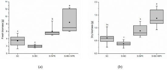 Effect of biochar and fertilizer on mean plants biomass (data from third cut): (a) fresh biomass and (b) dry biomass. Dots indicate mean values, horizontal lines in boxes indicate median. Letters indicate significant differences among the treatments (p = 0.05).