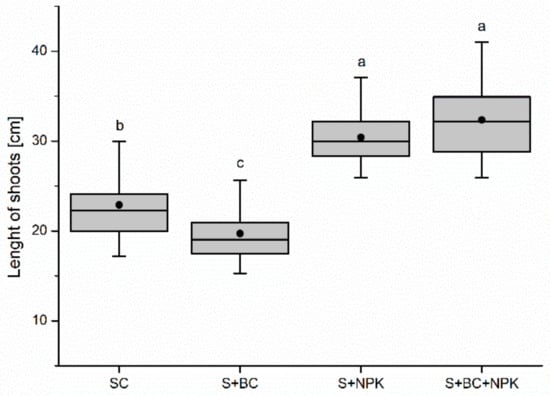 A similar negative effect of biochar on plant growth was indicated in plant height. The longest shoots were measured in S + BC + NPK treatment, while in the S + BC set, plant growth was even weaker than in the control set (Figure 3).