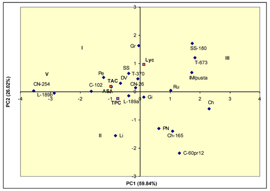 The second principal component (PC2) accounted for 26.02% of the total variation, with positive support of Lyc (0.959), TAC (0.171), and AsA (0.169), while TPC (−0.253) has a negative involvement. The third principal component (PC3) showed 13.80% of the overall variation and was positively associated with TAC (0.225), and AsA, as well as TPC (0.627) and Lyc (−0.244), were negatively associated with PC3. The fourth principal component (PC4) depicted a low proportion of the whole variability (0.33%), indicating the strongest discriminatory power of these two principal components (Figure 2). The biplot reveals a broad dispersion of the landraces and explained 85.86% of the variability. Negative values at PC1 indicate landraces with high TAC, ascorbic acid, and TPC.In this regard were highlighted the landraces from Cluster V, L-189a, C-102, and CN-245 have the highest values for TAC, AsA, and TPC, but a medium Lyc content. Positive values for PC2 belong to landraces having a high Lyc amount, SS-180, T-673, IM/pusta, and Ru, from Cluster III. The negative values of PC2 associated with positive values of PC1 are characteristic of the landraces with low levels of these traits like PN, Ch-165, and Ch-60pr12, grouped in Clusters II and IV, respectively. The landrace Li shows a higher TAC compared to PN and Ch-165 from Cluster II, thus being the main contributor to intra-cluster diversity. According to the dendrogram (Figure 1), it was noticed that there are different landraces groups inside Cluster I. Thus, landrace Gr with a high Lyc content exceeds the average values for TAC and ascorbic acid content, while SS-180 and T-673 with a high content of Lyc are associated with low values for the other qualitative traits.