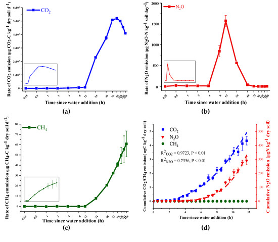 Soil gases (a) CO2, (b) N2O, (c) CH4 efflux rates, and (d) the accumulative amount released within 12 h after flooding. Dashed curves were all fitted by an allometric power equation. Error bars indicate standard errors. x axes are displayed on a logarithmic time scale and the insets in (a–c) show the same data from 15 min through 168 h after flooding presented on linear time scales.