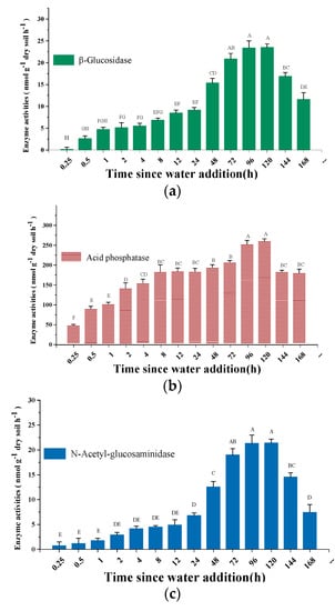 Soil enzyme activities, β-Glucosidase, N-Acetyl-glucosaminidase, and acid phosphatase, increased gradually at an early stage of flooding and reached a peak at 96 to 120 h, followed by a significant decline (p < 0.05) over time (Figure 2). All three enzymes were clearly active (p < 0.05) within 4 h of water addition, particularly for β-Glucosidase in which activity was enhanced immediately from about 0.17 to 4.72 nmol-MUB g−1 dry soil h−1 within 60 min after flooding. The maximum enzyme activities of β-Glucosidase, N-Acetyl-glucosaminidase, and acid phosphatase at the fourth day were between 6 to 142 times higher than that of the initial ones, from 0.17, 0.73, and 46.15 to 23.53, 21.40, and 258.61 nmol-MUB g−1 dry soil h−1, respectively. After that, a significant decline in enzyme activity was found over time (p < 0.05). For example, N-Acetyl-glucosaminidase activity dramatically declined to 14.55 nmol-MUB g−1 dry soil h−1 at day 6, and subsequently further decreased to 7.47 nmol g−1 dry soil h−1 at day 7.