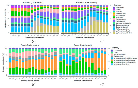 Changes in composition of bacterial (a,b) and fungal (c,d) community from rRNA amplicon analysis on the basis of DNA (a,c) and RNA (b,d). Colors in the stacked vertical bars correspond to the phylum level classification of each taxon, with exception of Proteobacteria, Firmicutes, and Ascomycota, which were classified to class level.
