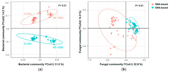 Principal coordinates analysis (PCoA) of (a) the unweighted UniFrac pairwise dissimilarity of the relative abundance of bacterial sequences and (b) of the Bray-Curtis distance of the relative abundance of fungal sequences. Difference between DNA- and RNA-based community was calculated by analysis of similarity (ANOSIM). Ellipses denote the samples from DNA- or RNA-based community at 95% confidence level.