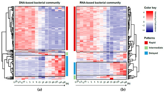 Heatmaps displaying the changes in the relative abundance of bacterial genera with abundance > 0.1% based on (a) DNA and (b) RNA community analysis over the time series. A similar trend in changes in the relative abundance and clustering of bacterial taxa were found over time. In both DNA- and RNA-based analysis, bacterial genera are significantly classified into three different responding patterns (dark red: rapid pattern; light green: intermediate pattern; light blue: delayed pattern) according to the changes of relative abundance over the time series.