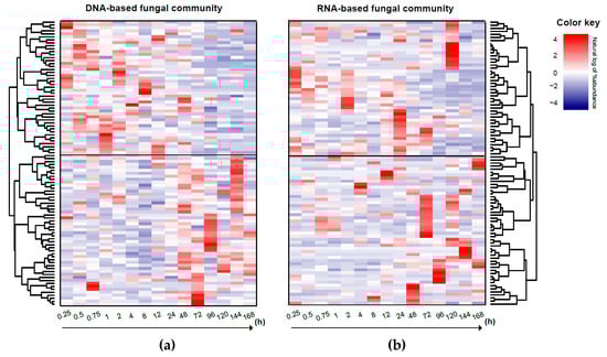 Heatmaps displaying the changes in the relative abundance of fungal genera with abundance > 0.5% based on (a) DNA and (b) RNA community analysis over the time series. Fungal taxa were significantly divided into two groups in the DNA-based fungal community but not in the RNA-based community.