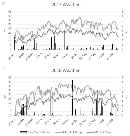 Daily maximum and minimum soil temperatures and precipitation between planting and harvesting in 2017 (a) and 2018 (b).