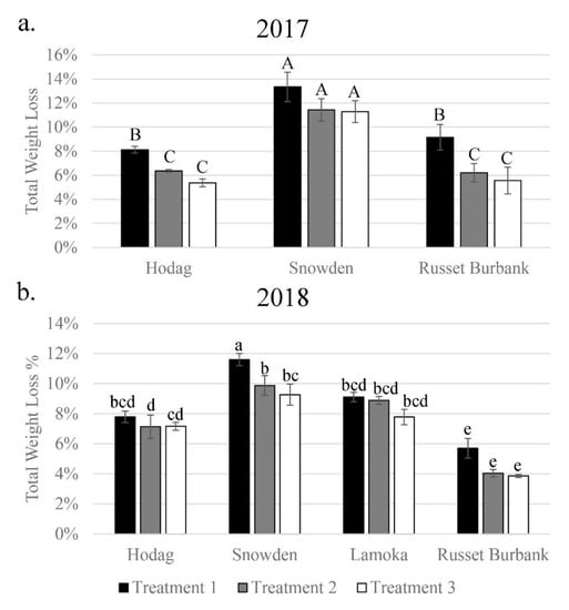 Total weight loss (%) of different varieties under the three wound-healing treatments in 2017 (a) and 2018 (b). In each figure, bars indicated with different letters are significantly different at α = 0.05 among different treatments and varieties.