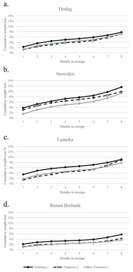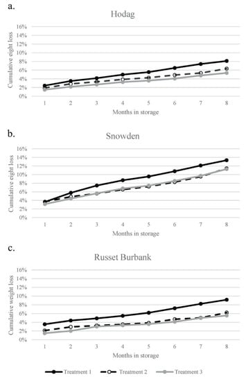 ANOVA results showed that in both years all the main effects, two-way and three-way interactions except variety × treatment interaction on monthly weight loss were significant at α = 0.05 (Table 1). In 2017 for Hodag, monthly weight loss under treatment 1 had always been higher than weight loss under the other two treatments over the eight-month storage time (Figure 4a). The same trends can be seen on Snowden and Russet Burbank (Figure 4b,c). For all three varieties under treatment 1, they lost more than 50% of their weight during the first three months of storage, and these trends under treatment 2 and 3 were not as apparent (Figure 4). Overall, cumulative weight loss of all varieties under treatment 1 were consistently higher than under treatment 2 and 3 (Figure 4).
