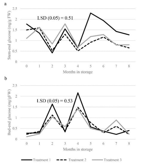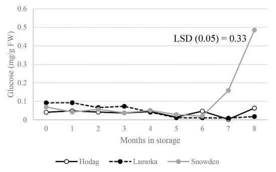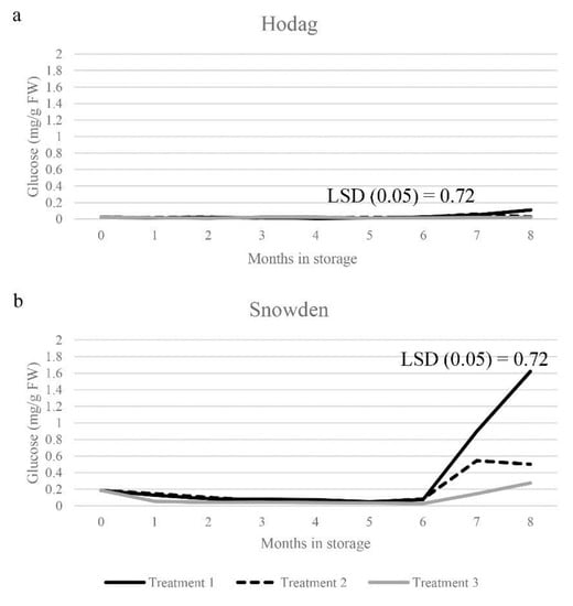 ANOVA shows that in 2017, all the main effects and their two-way and three-way interactions were highly significant (p < 0.001, Table 2), however in 2018, only the effects of variety, storage length and their two-way interactions were significant (Table 2). In 2017 for Hodag, not much difference can be seen on glucose content between different wound-healing conditions. Hodag is featured with its consistently low glucose levels during long-term post-harvest storage (Figure 6a). For Snowden, no difference can be observed until the seventh month in storage, and tubers under treatment 1 showed significantly higher levels of glucose than under the other treatments, however, under treatment 3 glucose stayed below 0.35 mg/g FW throughout the storage season (Figure 6b). In 2018, significant interaction between variety and storage length was shown in Figure 7. For Snowden in particular, there was a steep jump of glucose during the last two storage months.
