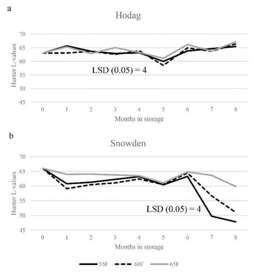 Figure 9a shows that Hodag always had Hunter L-values beyond 55 throughout the 8-month storage period, no matter what wound-healing conditions the tubers went through, and this again demonstrated Hodag’s premium long-term storability. However for Snowden, Hunter L-values under all treatments stayed high until the 6th month in storage, and steeply dropped below 50 under treatment 1 in the 7th month (Figure 9b). The numbers under treatment 2 decreased down to 51 in the 8th month, and numbers under treatment 3 stayed high all the time (Figure 9b). This together with the glucose content results suggest that Treatment 3 was helpful to maintain good fry quality for Snowden all season long.