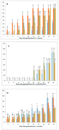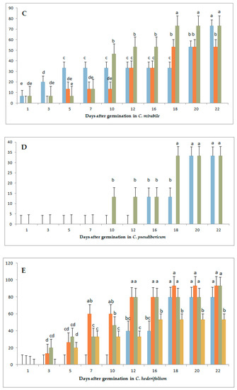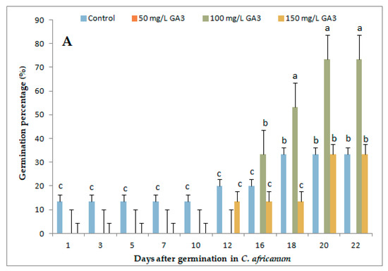 Compared to long-day exposure, it was observed that the germination percentages differed greatly when species were exposed to GA3 and short days (data not shown). With short days, higher GA3 rates increased germination (Figure 3). In C. africanum, GA3 administration delayed germination and 100 mg/L had the greatest germination percentage. Unlike long days, at a concentration of 50 mg/L the seeds did not germinate having 0% germination percentage. The best concentration with regards to plant development was that of 100 mg/L, being the concentration with the highest germination percentage, i.e., 80%.