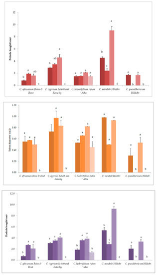 Except for C. africanum, in general, GA3 applied at 150 mg/L reduced the plant height, petiole length and tuber diameter, but increased the leaf area and radicle length. The 100 mg/L GA3 increased the height, petiole length, and tuber diameter but decreased the leaf area and radicle length. Regarding the species C. africanum a major increase in height of the plant and elongation of the petiole as well as a slight increase in leaf area was observed at the concentration of 150 mg/L. The tuber developed best at the concentration of 150 mg/L and the radicle at control. At the concentration of 50 mg/L the seeds did not germinate. Similar results regarding leaf area and plant height were recorded in Gazania rigens L (treasure flower) at 100 mg/L GA3 concentrations [33].