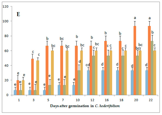 Effect of gibberellic acid (50, 100, and 150 mg/L GA3) and long-day exposure on germination percentage/day ± SE of selected Cyclamen species: (A) Cyclamen africanum (African cyclamen); (B) Cyclamen cyprium (Cyprus cyclamen); (C) Cyclamen mirabile (sowbread); (D) Cyclamen pseudibericum (false Iberian cyclamen); (E) Cyclamen hederifolium ‘Alba’ (ivy-leaved cyclamen). Values (mean ± SE) followed by different letters are significantly different based on Tukey’s HSD (honestly significant difference) test at p < 0.05.
