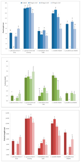Variation of morphological parameters in Cyclamen species based on different concentration of gibberellic acid (GA3). Different lowercase letters above the bars indicate significant differences between treatments, for each genotype, according to the Tukey’s HSD test (p < 0.05).