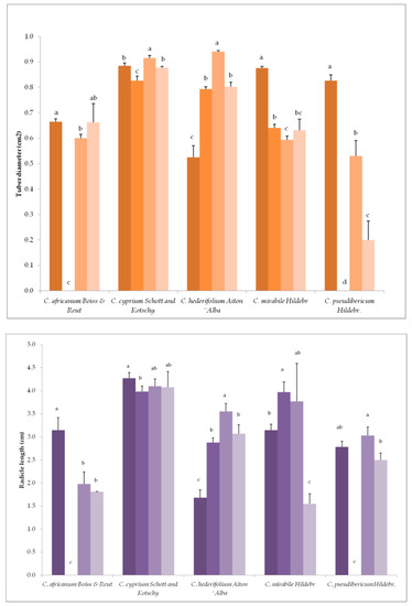 Germination of C. pseudibericum was irregular and none of the Cyclamen species germinated when 150 mg/L GA3 was applied (Figure 2). Height and petiole length of C. cyprium and C. mirabile was highest with 150 mg/L GA3. Regarding the plants of C. africanum, elongation of the plant and petiole, as well as leaf area, tuber diameter, and radicle length were greatest with 50 mg/L.