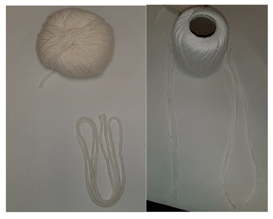 Images of the cotton (right) and the wool (left) fibers before the etching and the dyeing treatments.