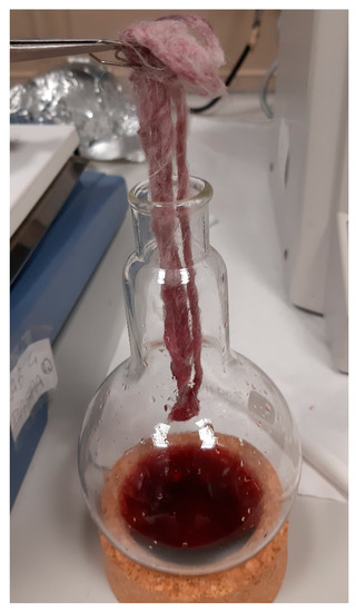 The extracts of Opuntia ficus-indica (L.) Miller were chemically characterized with spectroscopic and chromatographic techniques. The dye extracts were subjected to UV-VIS spectrophotometry (Merck Pharo 300) after appropriately diluting the solution containing the extracted dye with water (0.5 mg/mL) [25]. UV-VIS spectra were acquired in a visible region of 350–650 nm. For the quantitative internal standard, a calibration curve was prepared using final concentrations of 0.015, 0.032, 0.065, 0.130, 0.25, 0.5 and 1.0 mg/mL in triplicate. Quantitative determination was made taking into account the maximum absorbance of the absorption signal, at the wavelength of the analyzed colored compound reported and expressed in milligrams per gram of the prickly pear peels: the estimated amount of coloring compounds was 5 × 10−3 g/gpeel. The R2 interval was between 0.9849 and 0.9990 and the relative standard deviation (RSD) slope values between the measured samples were less than 5%.