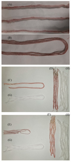 Series of pictures of the dyed fibers with and without mordanting. (A) The cotton and (B) wool without mordanting; (C) the cotton and (D) wool mordanting with lemon juice; (E) the cotton and (F) wool mordanting with aluminum potassium sulphate. The controls appear and are represented with letter (G) and (H) for the cotton and wool fibers, respectively.