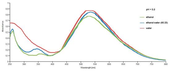 The extracts were primarily analyzed by UV-VIS spectrophotometry to evaluate the extraction of the pigments present within the extracts obtained with different extraction techniques and different solvents. The spectra obtained showed the presence of coloring molecules belonging to the betalain family. By comparing the spectra obtained for the extracts obtained through conventional maceration and the Naviglio method (data not shown for brevity), they showed that the extracts obtained under the same conditions (solvent, time, pH, ratio sample:solvent) with the Naviglio method had a higher content of coloring molecules compared to those obtained by maceration. Thus, it was concluded that the use of the Naviglio method allowed to obtain richer extracts in less time, as reported in the literature for other applications [38,39,40]. Figure 5 shows the spectra obtained from the analysis of the extracts of Opuntia ficus-indica (L.) Miller with the Naviglio method, which shows a better content of coloring molecules, even if only slightly, for the extract obtained with water.