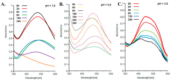 The visible absorption spectra of the extracts of the red-violet peels from the Opuntia ficus-indica (L.) Miller with the Extractor Naviglio® in water solvent, stored at 4 °C, are shown in Figure 6. Initially, only one peak at 535 nm could be detected, due to the presence of pigment molecules. These compounds were progressively degraded, while absorbance at 535 nm decreased at the same time. At pH 7, a small shoulder was observed with a maximum absorbance close to 410 nm, as a result of the degradation process. At pH 5, a new shoulder in the region between 455–465 nm could be detected, which was more intense in the samples incubated for longer times (more than 22 h). At pH 3, no shoulders were observed, while a peak in the 455–465 nm region was clearly depicted, especially in samples incubated from more than 6 h. The action of air and light, as well known, over time play an important role in the degradation of the pigment molecules of natural extracts [41].