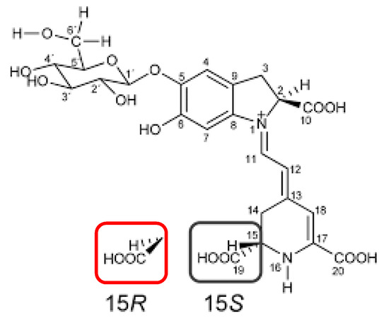 Chemical structures of betanin and isobetanin. The two structures differ in the spatial arrangement of the groups in position 15: betanin 15S (black), isobetanin 15R (red).