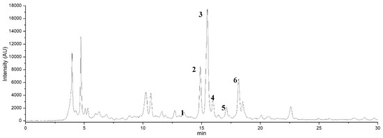 HPLC chromatogram detected at 340 nm the molecules contained in the aqueous extract of the peel of the fruits of Opuntia ficus-indica (L.) Miller obtained by the Extractor Naviglio®. Peaks 2 and 3 were identified as pigment molecules such as betanin and isobetanin. Peaks 1, 4, 5 and 6 were identified as luteolin, kaempferol, quercetin and isorhamnetin according to the standards available in the laboratory; the other peaks were unknown compounds.