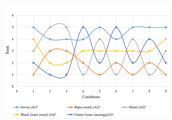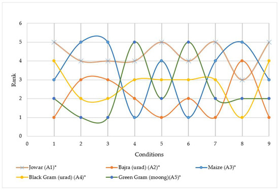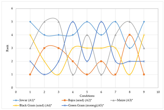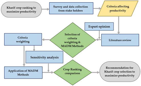 The kharif crops such as rice, Sorghum, Zea mays, cotton, ragi, Pennisetum glaucum, sugarcane, jute, etcetera, grow in dry and arid conditions. The soil and its nutrient value is an important component of sustainable farming [1]. Despite modern agricultural techniques, the high rate of population growth renders the crop yield inadequate [2]. The choice of a specific arrangement of crop patterns relies upon numerous criteria that differ from region to region [3]. The conception of the index was included in sustainability for the set of selected criteria and existing weather parameters by Dillon et al. [4]. Roy and Weng [5] examined the indicators of sustainable agriculture in Bangladesh. Sorensen et al. [6] suggested a cultivation selection method in the agricultural topography. Multiple attribute-based decision-making (MADM) techniques had been applied in diverse fields such as hydrologic sciences, ecological systems, agricultural systems, water resources systems, water supply, storage, and recycling [7,8,9]. MADM techniques have been successfully applied in energy sectors [10], industrial and automation engineering systems [11], robotics [12], etcetera. Srinivas et al. [13] published a MADM study related to the water quality of the river Ganga for the diffusion of trace metal. Agarwal and Garg [14] employed the MADM technique for the assessment of groundwater quality. Krol et al. [15] evaluated the sustainability of the maize cultivation in Poland using multi-criteria decision analysis and found that the same sowing method was not the best practice for small and large farm field, hence the criteria is of utmost importance for decision making. Mallick et al. [16] implemented a fuzzy- analytic hierarchy process (AHP) technique to evaluate landslide susceptibility. The study suggests that the criteria weighting must be normalized and the results obtained from the MADM techniques must be validated using sensitivity analysis. Other applications of MADM include the construction industry, information technology, and green chamber farming. A two-phase AHP-TOPSIS was applied to identify a suitable concrete mixture for high performance [17] and sustainable construction material and was determined by applying three MADM methods, namely optimal scoring method, AHP, and TOPSIS [18]. The ranking of cloud-based learning techniques was suggested by applying AHP [19]. A fuzzy based MADM model was studied to identify sustainable green chamber farming practices [20] to rank the vegetable cash crops based on several criteria and a model was suggested to aid the stakeholders to identify the best farming practices.